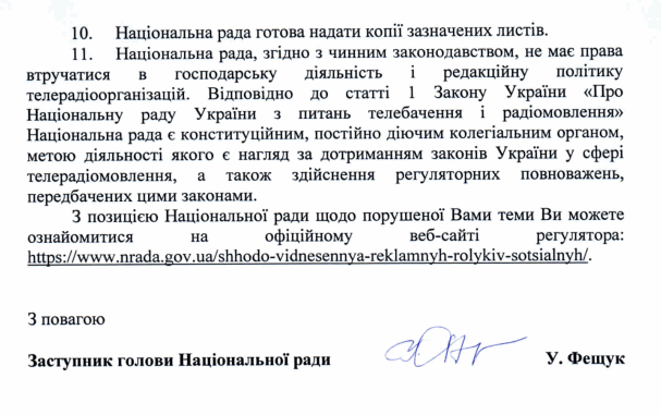 "Национальный совет получил письмо от Генпрокуратуры Украины с просьбой предоставить разъяснение о предоставлении аудиовизуальным материалам статуса социальной рекламы без ссылки на любой ролик (вх. № 10/114 от 06.02.2018), - говорится в ответе.