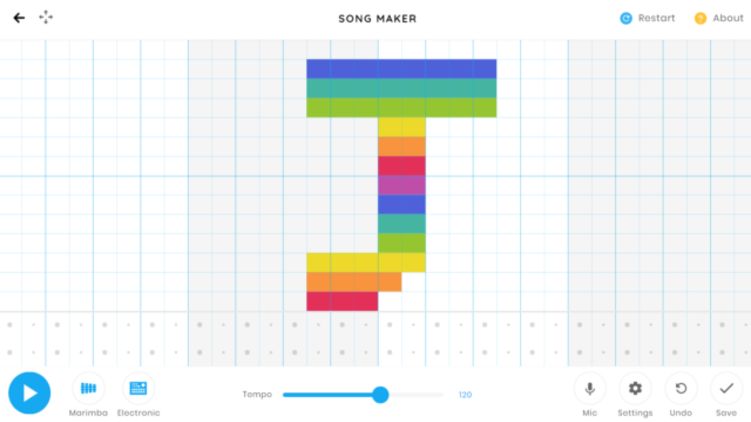 Song Maker состоит из двух разделов. Первый, самый большой, отвечает за основу мелодии, а нижний, поменьше, - за ритм. Существует выбор между несколькими музыкальными опциями в каждом разделе. Создавать мелодию, состоящую из расположенных в определенном порядке меток, можно с помощью мыши, клавиатуры или пальца, в зависимости от того, на каком устройстве ведется работа. Для создания мелодии можно подключить MIDI-клавиатуру или использовать микрофон для воспроизведения нужной ноты.
