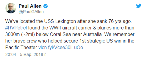 "Мы обнаружили USS Lexington спустя 76 лет после того, как он затонул. Поисковое судно RV Petrel обнаружило авианосец и самолеты времен Второй мировой войны на глубине более трех тысяч метров в Коралловом море близ Австралии", - говорится в сообщении.