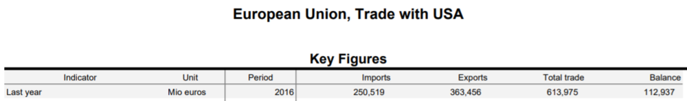 Евросоюзу на американском рынке есть, что терять. ЕС традиционно продает в США больше, чем покупает оттуда. Положительное сальдо, например, за 2016 год составляет 113 миллиардов евро.