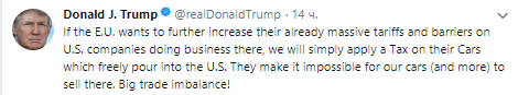 "Если Евросоюз хочет дальше повышать и без того высокие тарифы для американских компаний, которые там работают, мы просто введем налог на их автомобили", - написал он в Twitter.