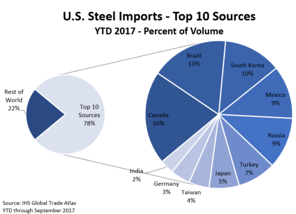 Если верить статистике США, стран Евросоюза среди главных поставщиков стали в Америку нет. Топовые импортеры - это Канада, Бразилия, Южная Корея, Мексика и Россия.