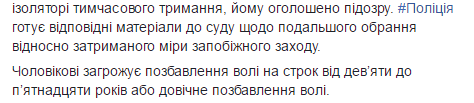 Открыто уголовное производство по ст. 348 Уголовного кодекса (посягательство на жизнь сотрудника правоохранительного органа). Нападавший задержан и находится в изоляторе временного содержания, ему объявлено подозрение.