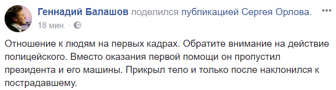 "Отношение к людям на первых кадрах. Обратите внимание на действие полицейского. Вместо оказания первой помощи он пропустил президента и его машины. Прикрыл тело и только после наклонился к пострадавшему", - отмечает политик Геннадий Балашов, чья видеокамера зафиксировала инцидент.