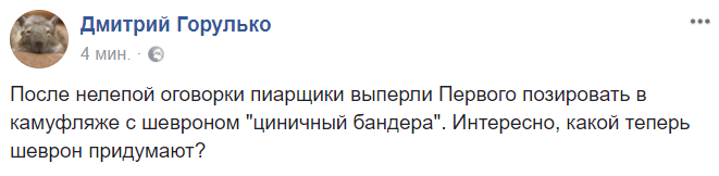 "После нелепой оговорки пиарщики выперли Первого позировать в камуфляже с шевроном "циничный бандера". Интересно, какой теперь шеврон придумают?", - интересуется журналист Дмитрий Горулько.
