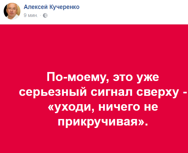 "По-моему, это уже серьезный сигнал сверху - "уходи, ничего не прикручивая"", - считает экс-министр Алексей Кучеренко.