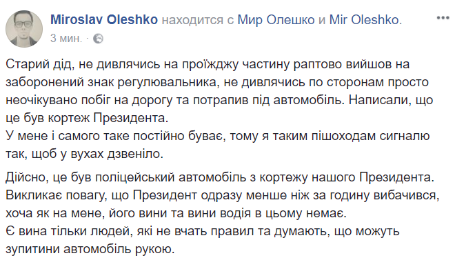 А вот блогеры, поддерживающие президента, ополчились на старика, которого сбила президентская машина. Так, известный "порохобот" Мирослав Олешко заявил, что у него "такое постоянно бывает", а виноват исключительно пешеход.