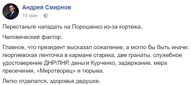 Главное, что президент высказал сожаление, а могло бы быть иначе: георгиевская ленточка в кармане старика, две гранаты, служебное удостоверение ДНР/ЛНР, деньги Курченко, задержание, мера пресечения, "Миротворец" и тюрьма.