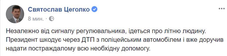 "Независимо от сигнала регулировщика, речь идет о пожилом человеке. Президент сожалеет о ДТП с полицейским автомобилем и уже поручил оказать пострадавшему всю необходимую помощь", - написал пресс-секретарь Порошенко Святослав Цеголко.