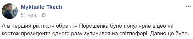 "А в первый год после избрания Порошенко было популярно видео как кортеж президента однажды остановился на светофоре. Давно это было".