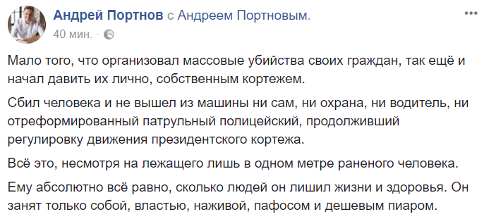 Ему абсолютно всё равно, сколько людей он лишил жизни и здоровья. Он занят только собой, властью, наживой, пафосом и дешевым пиаром", - пишет юрист Андрей Портнов.