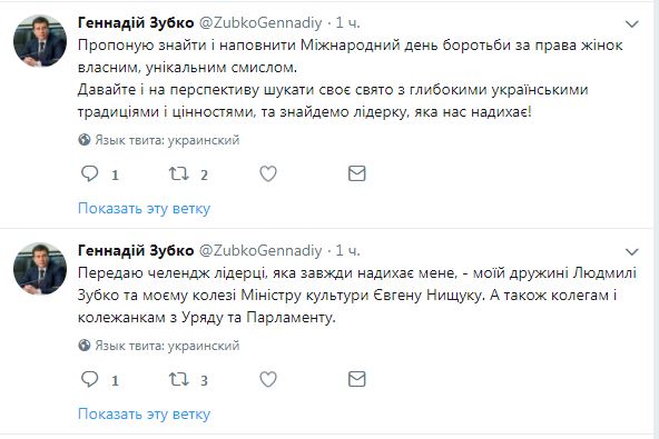 Он передал челендж своей жене Людмиле Зубко и министру культуры Евгению Нищуку, а также другим коллегам и колежанкам из правительства и парламента".