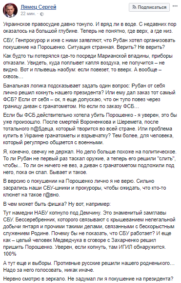 "Я, конечно, свечку не держал. Но дело больше похоже на политическое. То ли Рубан не первый раз таскал оружие, а теперь его решили "слить", чтобы... То ли он ничего не вез, а диван с гранатометом подложили под него, пока он спал. Бывает и такое", – написал журналист Сергей Лемец.