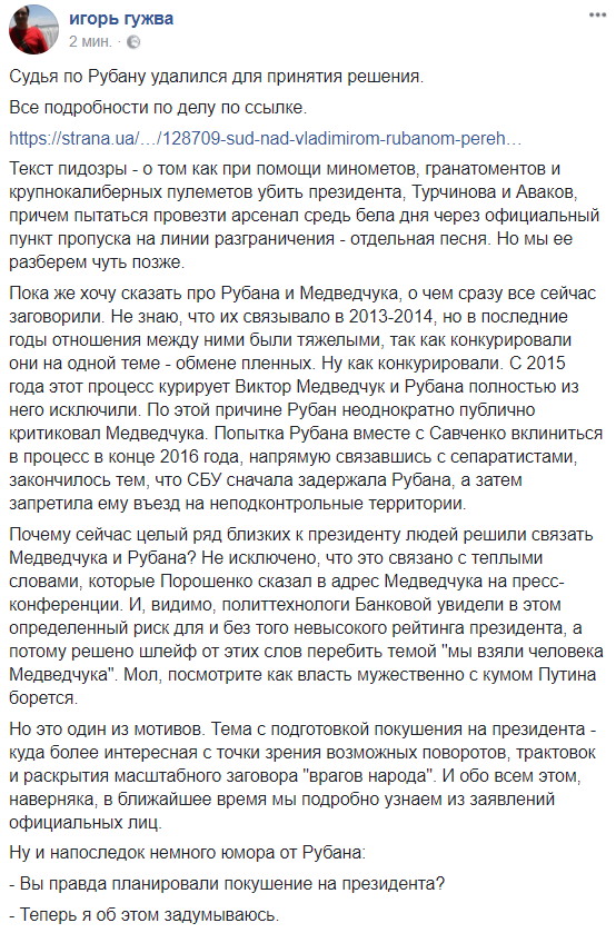 Пока же хочу сказать про Рубана и Медведчука, о чем сразу все сейчас заговорили. Не знаю, что их связывало в 2013-2014-е, но в последние годы отношения между ними были тяжелыми, так как конкурировали они на одной теме – обмене пленных. Ну как конкурировали. С 2015 года этот процесс курирует Виктор Медведчук и Рубана полностью из него исключили. По этой причине Рубан неоднократно публично критиковал Медведчука. Попытка Рубана вместе с Савченко вклиниться в процесс в конце 2016 года, напрямую связавшись с сепаратистами, закончилась тем, что СБУ сначала задержала Рубана, а затем запретила ему въезд на неподконтрольные территории.