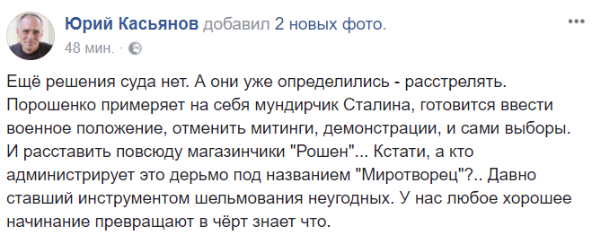 15:08  "Еще решения суда нет. А они уже определились – расстрелять. Порошенко примеряет на себя мундирчик Сталина, готовится ввести военное положение, отменить митинги, демонстрации и сами выборы. И расставить повсюду магазинчики "Рошен"... Кстати, а кто администрирует это дерьмо под названием "Миротворец"?.. Давно ставший инструментом шельмования неугодных. У нас любое хорошее начинание превращают в чёрт знает что", – пишет волонтер Юрий Касьянов.