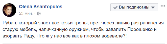 15:03  "Рубан, который знает все козьи тропы, прет через линию разграничения старую мебель, напичканную оружием, чтобы завалить Порошенко и взорвать Раду. Что ж у нас все как в плохом водевиле?!" – в соцсетях удивляются рассказу обвинения.