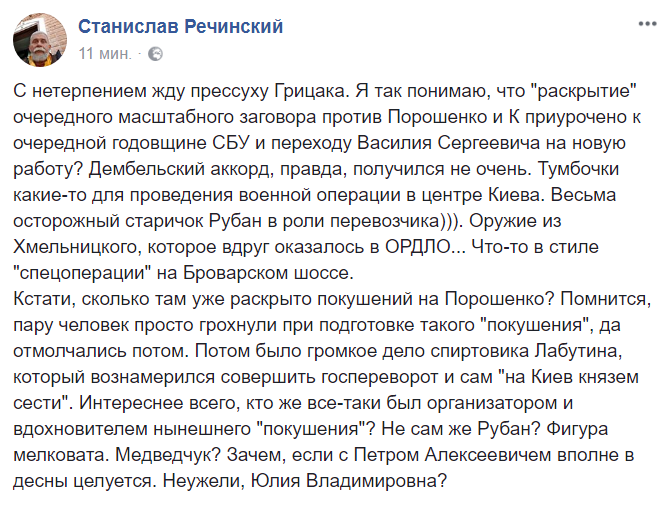 "С нетерпением жду прессуху Грицака. Я так понимаю, что "раскрытие" очередного масштабного заговора против Порошенко и К приурочено к очередной годовщине СБУ и переходу Василия Сергеевича на новую работу? Дембельский аккорд, правда, получился не очень. Тумбочки какие-то для проведения военной операции в центре Киева. Весьма осторожный старичок Рубан в роли перевозчика))). Оружие из Хмельницкого, которое вдруг оказалось в ОРДЛО... Что-то в стиле "спецоперации" на Броварском шоссе.