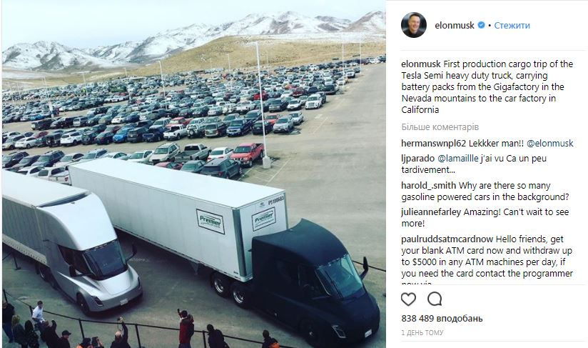 Он назвал доставку грузов Tesla Semi "промышленной эксплуатацией", однако, как отмечается, компания начнет серийное производство таких грузовиков только в следующем году.