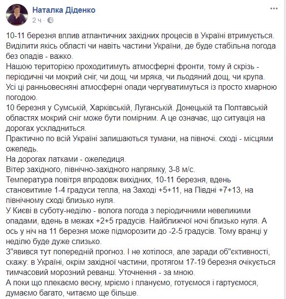 "И не хотелось, но ради объективности, скажу: в Украине, кроме западной части, в течение 17-19 марта ожидается временный морозный реванш. Уточнение - за мной", - отметила синоптик.