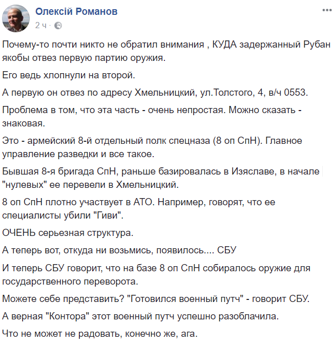 Еще на одно "белое пятно" указывает журналист Алексей Романов. Он говорит, что за попыткой сделать из Рубана "террориста №1" никто не заметил настоящий военный путч, наличие которого следует хотя бы из текста "пидозры" переговорщику