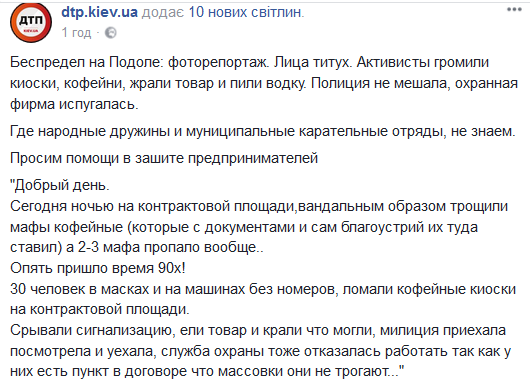 "Сегодня ночью на Контрактовой площади, вандалы громили мафы кофейные (которые с документами и сам "Благоустрой" их туда ставил) а 2-3 мафа пропало вообще. Опять пришло время 90-х! 30 человек в масках и на машинах без номеров, ломали кофейные киоски на Контрактовой площади. Они срывали сигнализацию, ели товар и крали что могли, полиция приехала - посмотрела и уехала, служба охраны тоже отказалась работать, так как у них есть пункт в договоре что массовки они не трогают", - приводит портал свидетельства очевидцев.