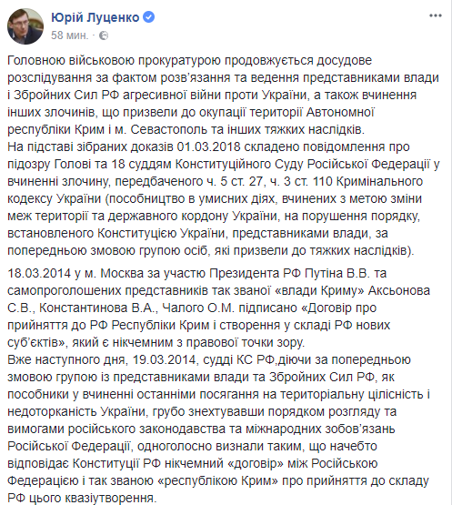 "Таким образом, искусственная легитимизация руководством Российской Федерации оккупации части территории Украины - Автономной республики Крым и города Севастополь, была бы невозможной без указанного незаконного решения судей Конституционного Суда РФ. Судьи Конституционного суда Российской Федерации способствовали представителям власти и Вооруженных Сил РФ путем устранения препятствий в совершении ими умышленных действий с целью изменения границ территории и государственной границы Украины на нарушение порядка, установленного Конституцией Украины, которые привели к тяжелым последствиям в виде оккупации части территории Украины и причинения материального ущерба нашему государству на сумму более 1 триллиона грн", - говорят в ГПУ.
