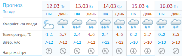 Сайт Укргидрометцентра прогнозирует осадки в виде дождя и мокрого снега. Наиболее интенсивные осадки ожидаются 13-14 марта. Дневная температура +3...+7, ночью 0...+4.