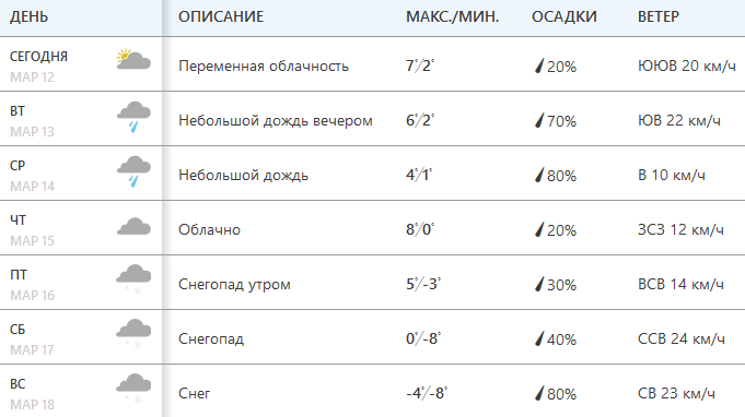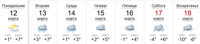 Сайт Gismeteо также прогнозируетнеделю дождей: со вторника по воскресенье. При этом на выходных дождь сменится мокрым снегом. Днем +3...+7, ночью 0...+3. С 18 марта резко похолодает до -9 днем и -12 ночью.