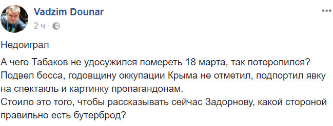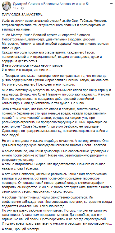 "Читаю сегодня ФБ-некрологи по Табакову. Некоторые советские пионеры обандерились уже круче членов ОУН и стреляют громче воинов УПА. Словно Союзмультфильм у них ассоциируется с трудным детством. Противно. Никакие не "циничные бандеры", а приспособленцы беспринципные. Скоро убедитесь в очередной раз, когда пойдут сдавать нынешних кумиров, как стеклотару".
