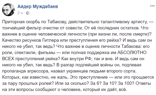 Журналист Айдер Муждабаев называет скорбь по Табакову "приторной". Он сравнивает актера с Гитлером, который, мол, тоже был художником. И обвиняет его в "поддержке преступлений рейха".