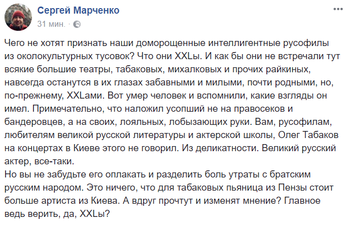 "Чего не хотят признать наши доморощенные интеллигентные русофилы из околокультурных тусовок? Что они XXLы. И как бы они ни встречали тут всякие большие театры, табаковых, михалковых и прочих райкиных, навсегда останутся в их глазах забавными и милыми, почти родными, но, по-прежнему, XXLами. Вот умер человек и вспомнили, какие взгляды он имел. Примечательно, что наложил усопший не на правосеков и бандеровцев, а на своих, лояльных, лобызающих руки. Вам, русофилам, любителям великой русской литературы и актерской школы, Олег Табаков на концертах в Киеве этого не говорил. Из деликатности. Великий русский актер, все-таки.