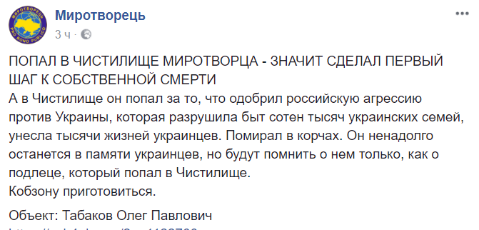 "Попал в Чистилище "Миротворца" – значит сделал первый шаг к своей собственной смерти", – гласит заголовок поста "Миротворца" в Facebook.