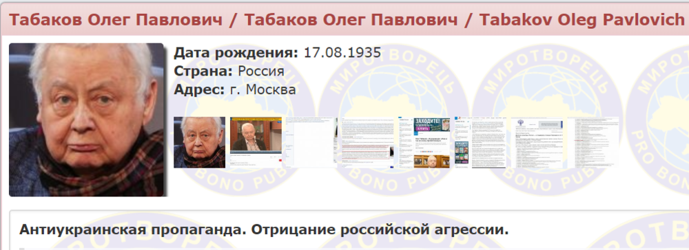 Впрочем, главная претензия к Табакову у них из-за его политических позиций. После поддержки аннексии Крыма он попал на "Миротворец". Табаков и правда не признавал права Украины на полуостров.
