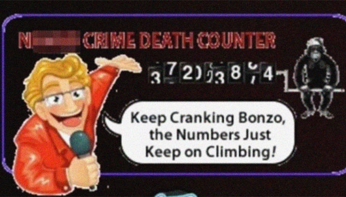 На гифке можно увидеть обезьяну, которая крутит барабан с числами. Над ней написано Nigger Crime Death Counter (Счетчик смерти преступника ниггера), а рядом стоит человек, который говорит: Keep Cranking Bonzo, the Numbers Just Keep on Climbing (Продолжай крутить, Бонзо, числа просто растут).