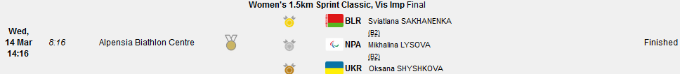26-летняя харьковчанка Оксана Шишкова завоевала "бронзу" среди спортсменов с нарушением зрения в лыжном спринте на 1,5 километра.