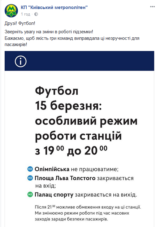Матч начнется в 20.00 и киевский метрополитен в своем Facebook уже предупредил об органичениях на центральных станциях.