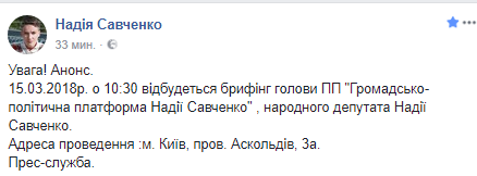 Согласно сообщению в Facebook, Савченко в четверг, 15 марта в 10:30 даст брифинг по адресу Аскольдов переулок, 3а. Именно здесь находится Главное управление Службы безопасности Украины в Киеве и Киевской области.