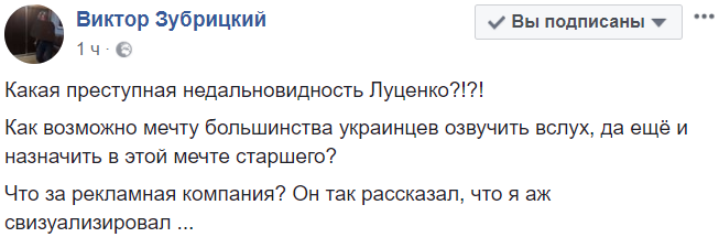 Как возможно мечту большинства украинцев озвучить вслух, да ещё и назначить в этой мечте старшего? Что за рекламная компания? Он так рассказал, что я аж свизуализировал ...", - пишет политолог Виктор Зубрицкий.