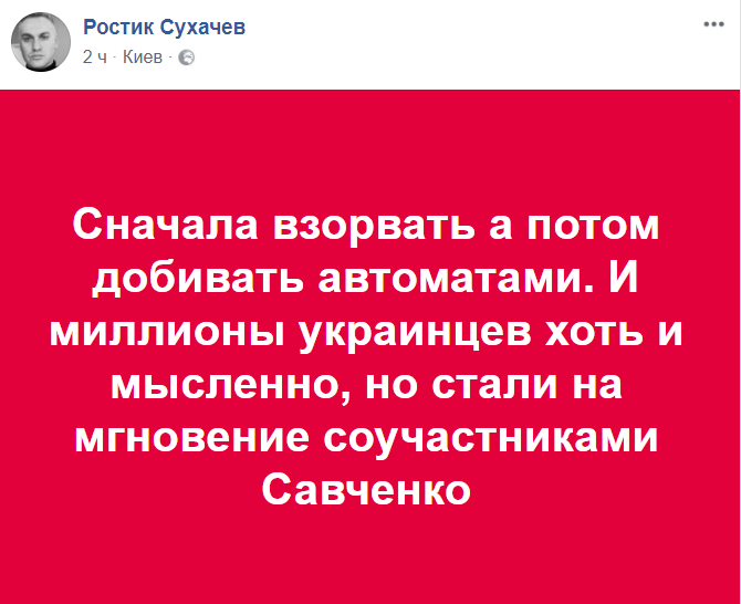 "Сначала взорвать а потом добивать автоматами. И миллионы украинцев хоть и мысленно, но стали на мгновение соучастниками Савченко", - вторит им телеведущий Ростислав Сухачев.