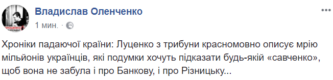 "Хроники падающей страны: Луценко с трибуны красноречиво описывает мечту миллионов украинцев, которые мысленно хотят подсказать любой "савченко", чтобы она не забыла и Банковую, и Резницкую", - пишет блогер Владислав Оленченко.