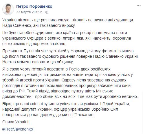 Президент Петр Порошенко так высказывался о Надежде Савченко и суде над ней: "Это было позорное судилище, которое страна-агрессор устроила против украинского Офицера с большой буквы, которая, как и положено, защищала свою землю от вражеских посягательств".
