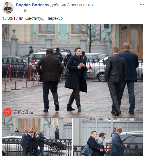 В сети появились фото народного депутата Надежды Савченко, в окружении трех мужчин, среди которых замечен нардеп от "Народного фронта" Андрей Левус. Снимки опубликовал на своей странице в Facebook журналист Богдан Бортаков.