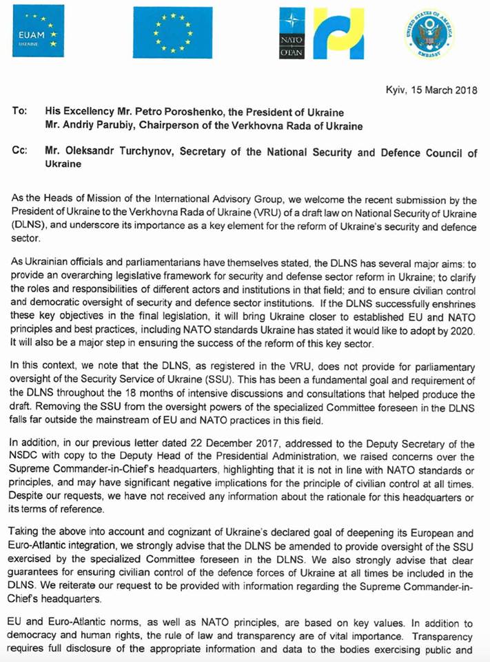 Посол США Мари Йованович, глава Представительства ЕС в Украине Хью Мингарелли, глава Консультативной миссии Европейского Союза в Украине Кястутис Ланчинскас и глава Представительства НАТО в Украине Александр Винников раскритиковали президентский закон о национальной безопасности. Об этом они сообщили в письме адресованном Петру Порошенко.