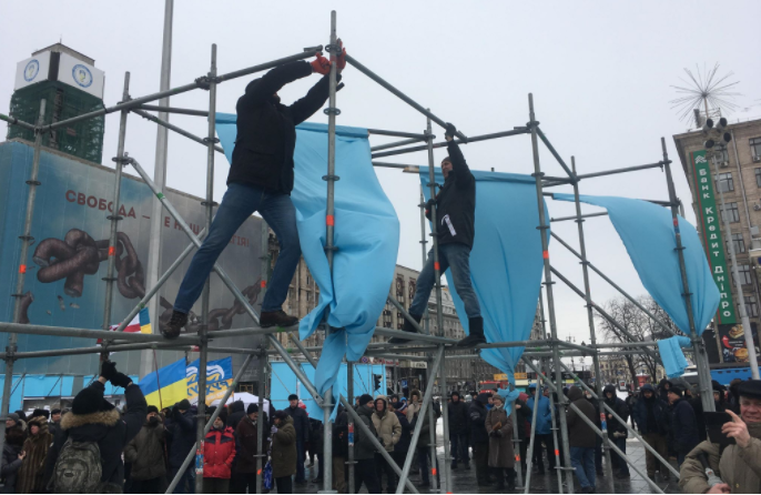 Во время марша за импичмент Петра Порошенко митингующие на Майдане разобрали металлические конструкции, установленные ранее.Они заявили, что установкой этих конструкций власть пыталась помешать собранию.