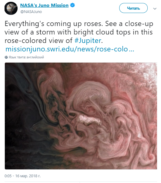 Национальное управление по аэронавтике и исследованию космического пространства NASA опубликовало снимки бури на Юпитере. Об этом говорится в Twitter исследовательской группы.
