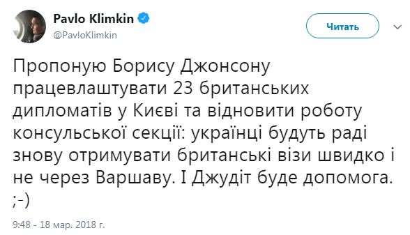 "Предлагаю Борису Джонсону трудоустроить 23 британских дипломатов в Киеве и восстановить работу консульской секции: украинцы будут рады снова получать британские визы быстро и не через Варшаву. И Джудит будет помощь", - отметил Климкин.