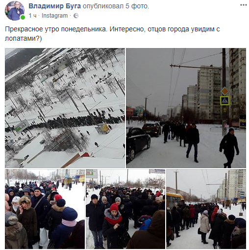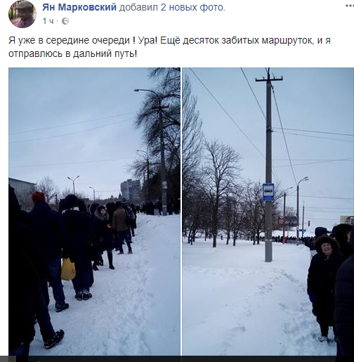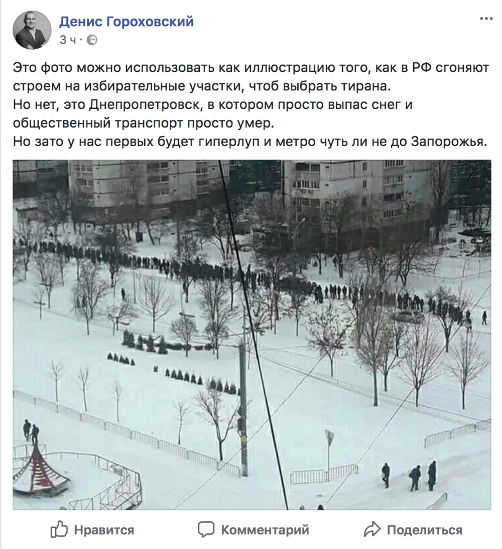 "Это фото можно использовать как иллюстрацию того, как в РФ сгоняют строем на избирательные участки, чтоб выбрать тирана. Но нет, это Днепропетровск, в котором просто выпал снег и общественный транспорт просто умер. Но зато у нас первых будет гиперлуп и метро чуть ли не до Запорожья", – пишет журналист Денис Гороховский.