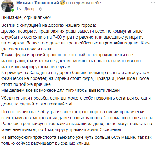 "Друзья, поверьте, предприятия рады вывезти всех, но коммунальные службы по состоянию на 7:00 не расчистили выездные улицы из автопарков, более того – даже из троллейбусных и трамвайных депо. Кое-где снега по пояс и выше.