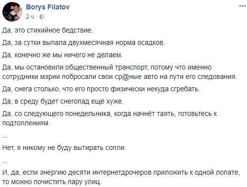 В свою очередь мэр Днепра Борис Филатов в свойственной ему манере иносказательно "послал" всех тех, кто жалуется на снежный коллапс, и дал понять, что люди сами виноваты – мол, побросали машины где попало.
