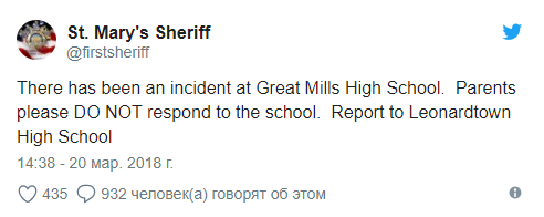 Офис шерифа округа Сент-Мэри подтвердил в Twitter инцидент в школе Great Mills и попросил родителей не приводить детей на занятия. Других подробностей не сообщается.